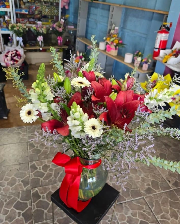 Un arreglo alegre y lleno de color que combina 4 rosas amarillas, 4 naranjas y 4 lilas, junto a un paquete de astromelias blancas que aporta elegancia y frescura. Todo presentado en un florero de 3×10 cm, decorado con un moño delicado y una tarjeta de dedicatoria para hacerlo aún más especial.