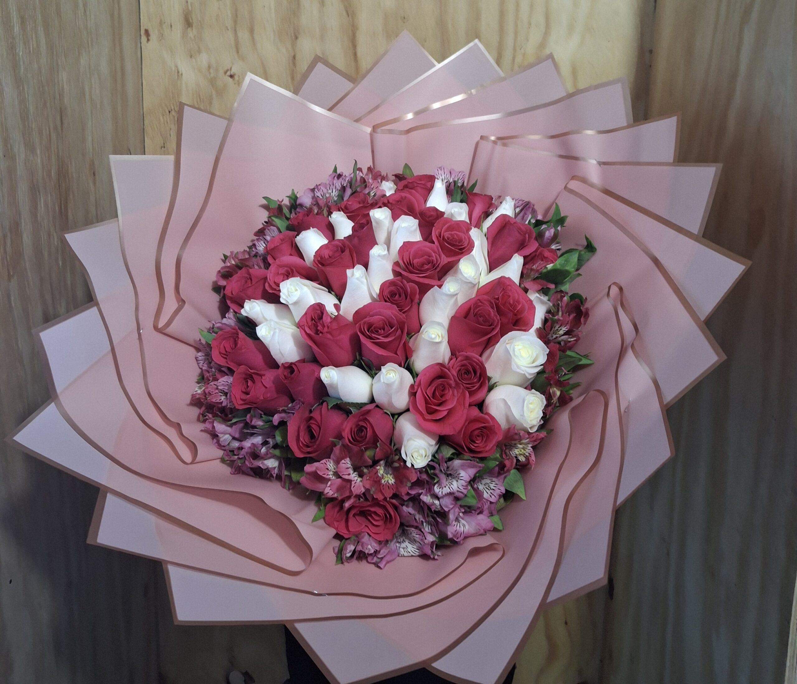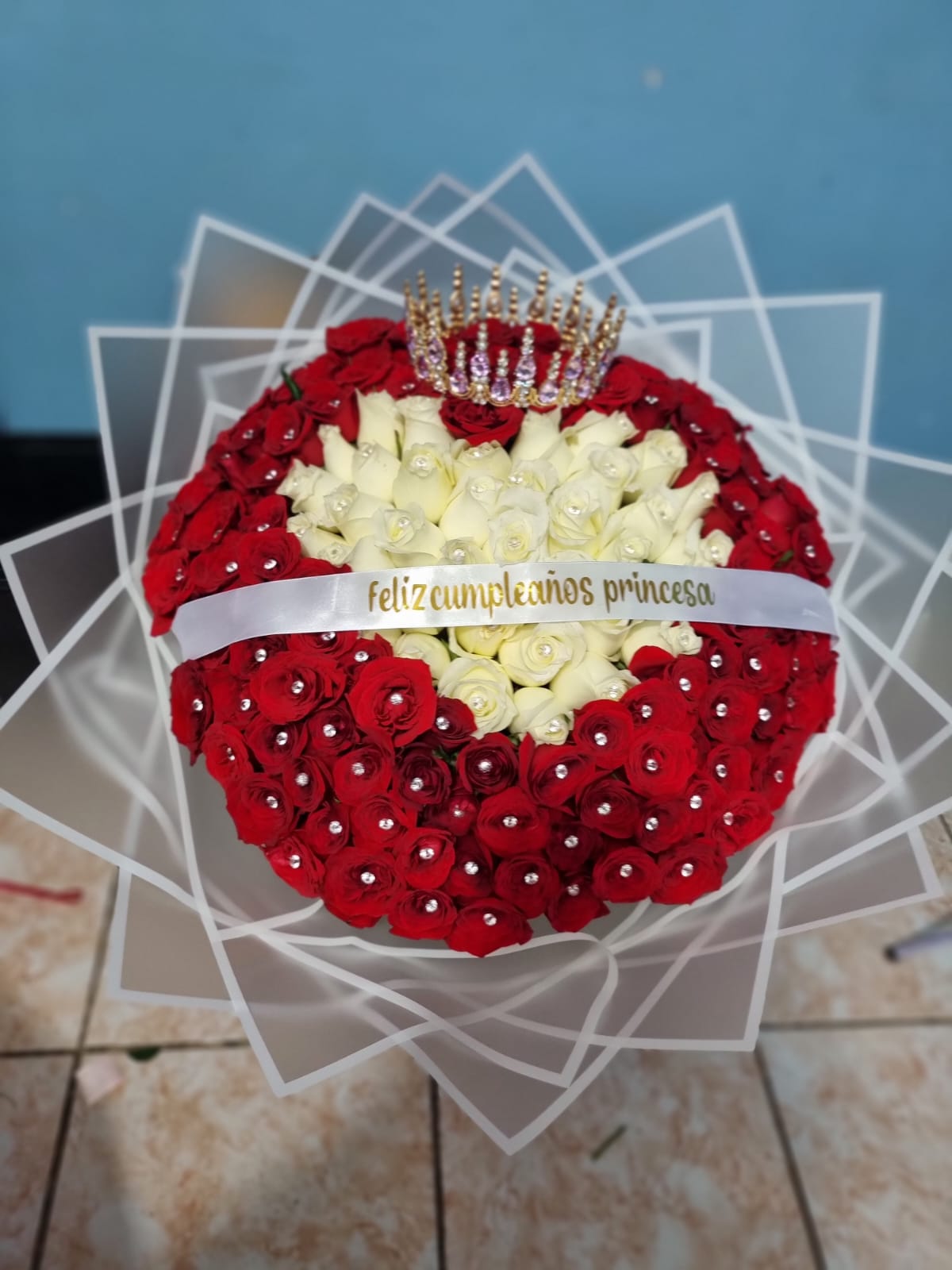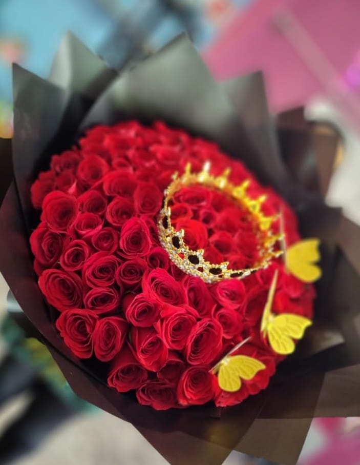Imponente y elegante, este ramo reúne 100 rosas rojas adornadas con 3 mariposas grandes y una majestuosa corona metálica. Todo presentado en papel coreano elegante, ideal para sorprender en grande.